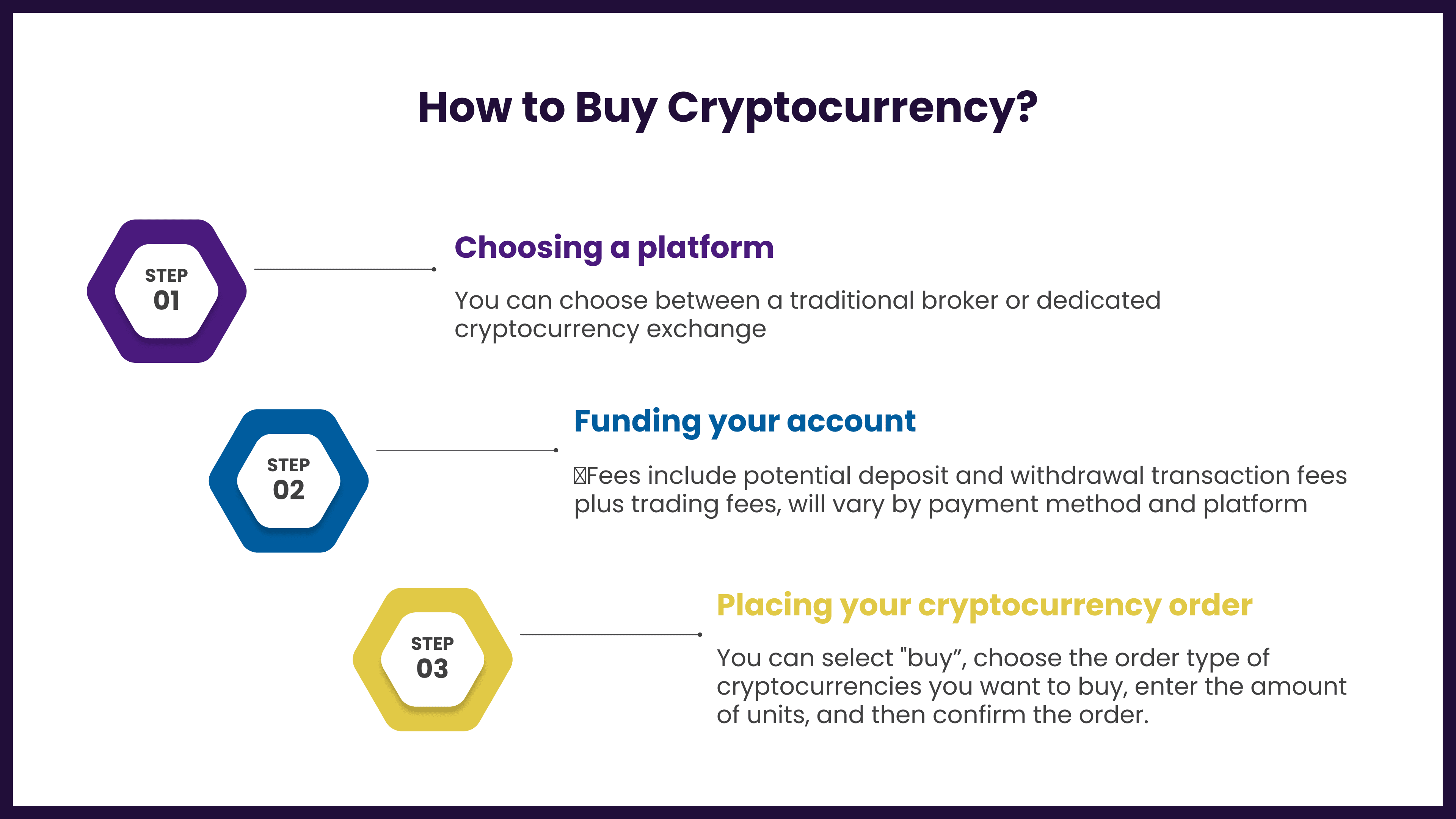 You are ready to place an order via your traditional broker’s or exchange’s platform once your account is funded. You can select “buy”, choose the order type of cryptocurrencies you want to buy, enter the amount of units, and then confirm the order. The same process applies to the “sell” process.
