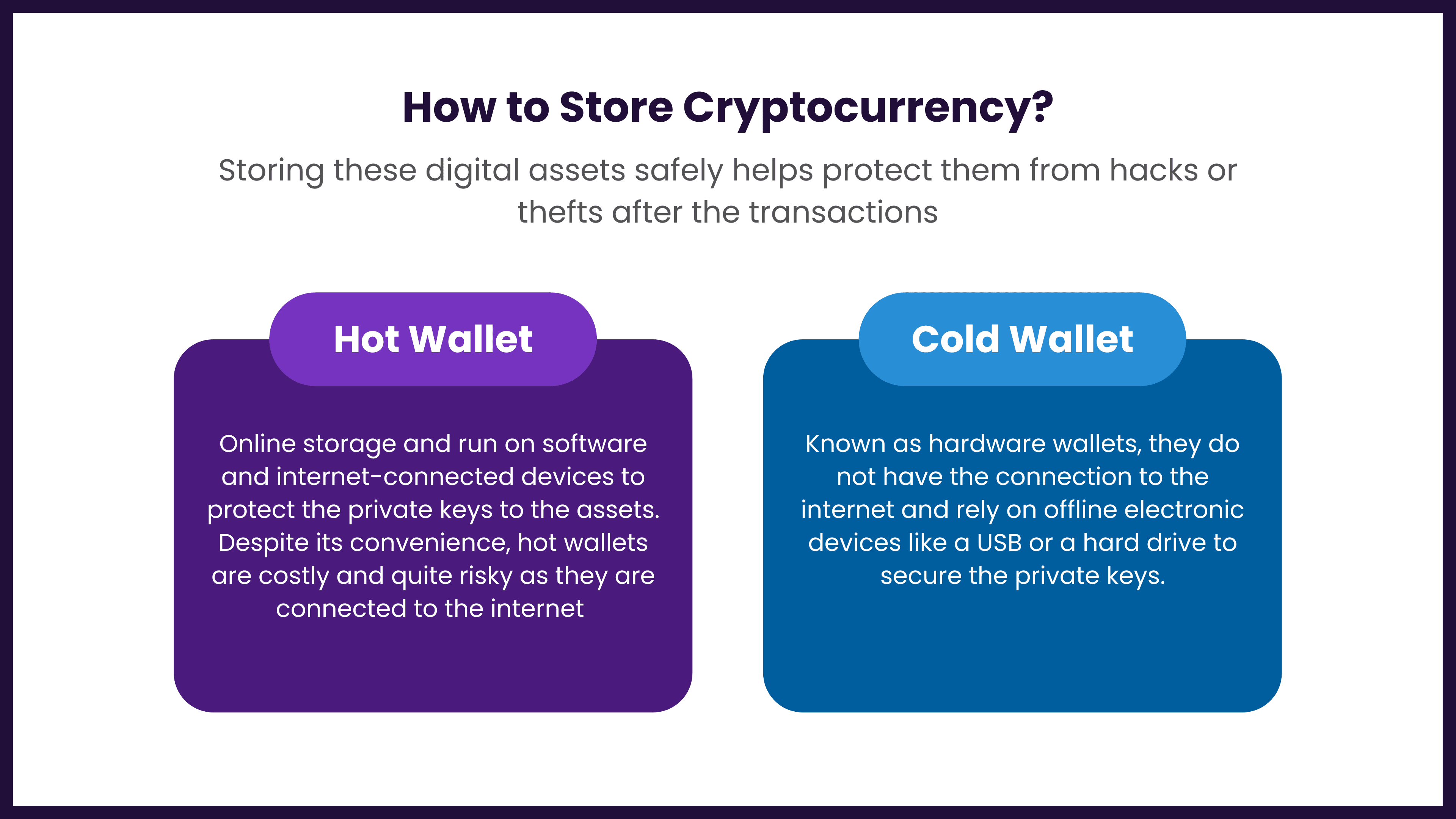 Storing these digital assets safely helps protect them from hacks or thefts after the transactions. Cryptocurrency is stored in crypto wallets with the form of physical devices or online software to hold the private keys to your cryptocurrencies securely.
